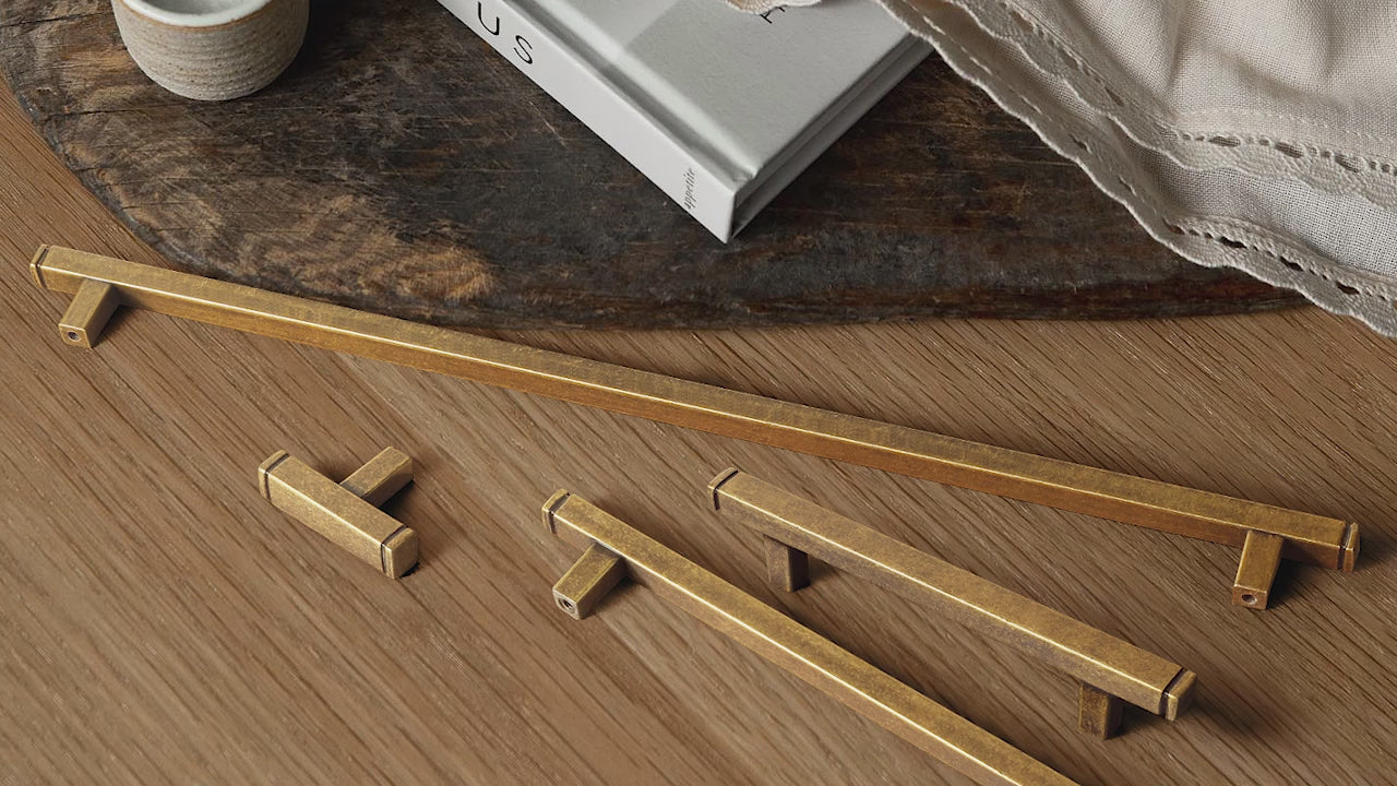 Les poignées d'armoire et de tiroir Goo-ki Bar sont disponibles en plusieurs finitions et une variété de longueurs allant d'un seul trou à 12-3/5 pouces.